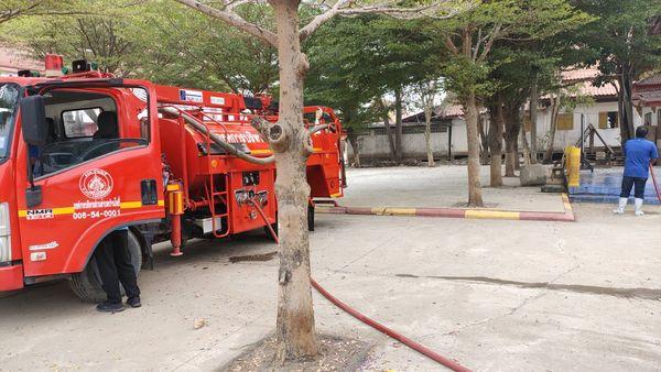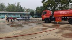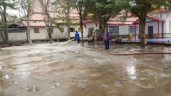 เทศบาลตำบลหัวเวียง ขอขอบพระคุณ งานป้องกันฯเทศบาลเมืองเสนา และงานป้องกันฯองค์การบริหารส่วนตำบลบ้านโพธิ์ที่ให้ความอนุเคราะห์รถบรรทุกฉีดน้ำล้างทำความสะบริเวณลานวัดบันไดช้าง