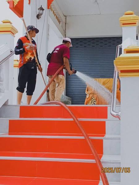 นำรถบรรทุกน้ำฉีดล้างทำความสะอาดบริเวณเมรุและโดมวัดบางกะทิง เพื่อใช้จัดงานฌาปณกิจศพ