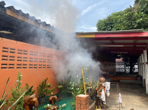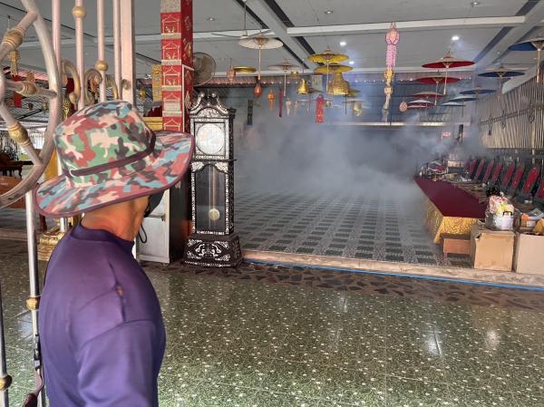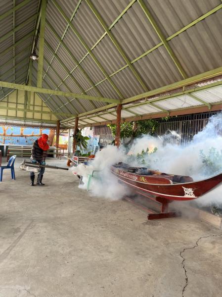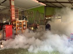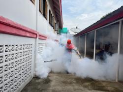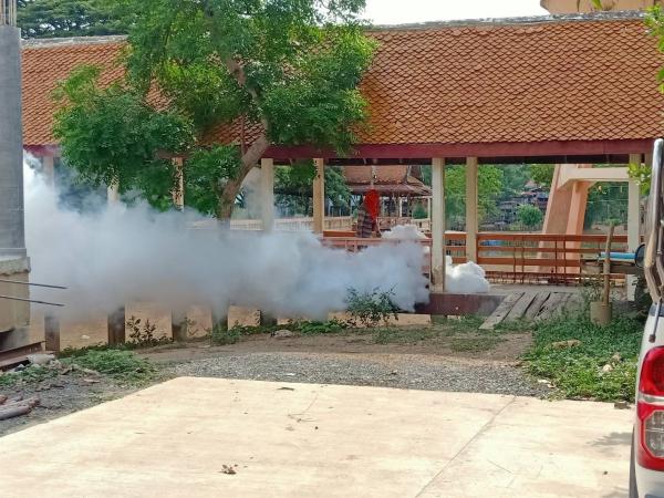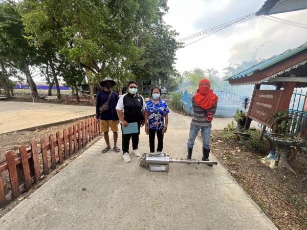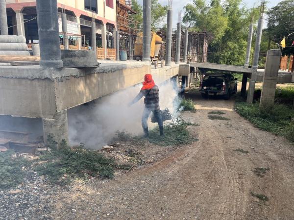กองสาธารณสุขฯนำเจ้าหน้าที่ลงพื้นที่ฉีดพ่นเคมีหมอกควันกำจัดยุงลายตามโครงการควบคุมและป้องกันโรคไข้เลือดออก ประจำปีงบประมาณ 2566