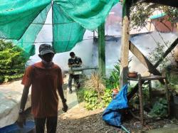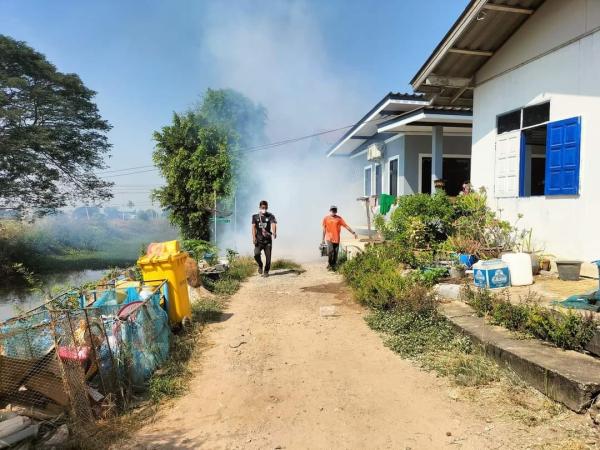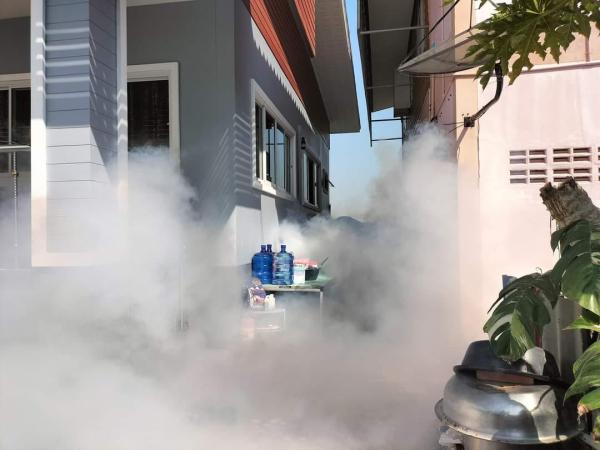 กองสาธารณสุขและสิ่งแวดล้อม ลงพื้นที่ดำเนินการฉีดพ่นเคมีหมอกควันกำจัดยุงลายบริเวณบ้านผู้ป่วยโรคไข้เลือดออกในหมู่ที่ 3 ต.บ้านกระทุ่ม