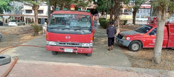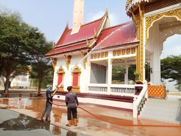 งานป้องกันฯนำเจ้าหน้าที่นำรถบรรทุกน้ำล้างทำความสะอาดบริเวณเมรุและโดมวัดอินทาราม