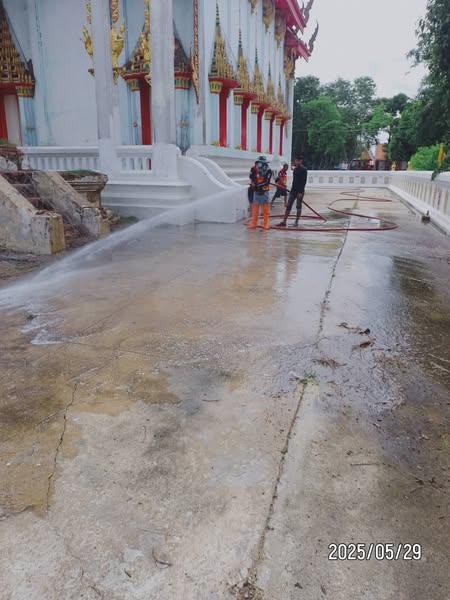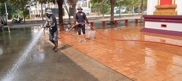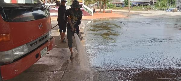 นำรถบรรทุกน้ำฉีดล้างทำความสะอาด บริเวณโบสถ์และลานวัดโบสถ์(บน) หมู่ที่ 6 ต.บ้านกระทุ่ม