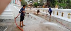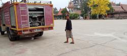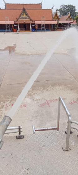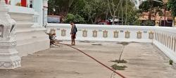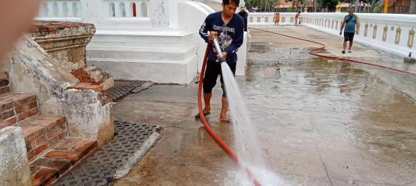 งานป้องกันฯ นำรถบรรทุกน้ำล้างทำความสะอาดบริเวณโบสถ์และลานวัดโบสถ์(บน) ต.บ้านกระทุ่ม