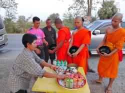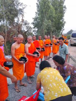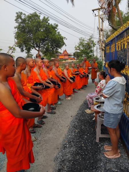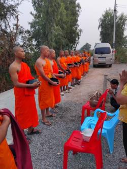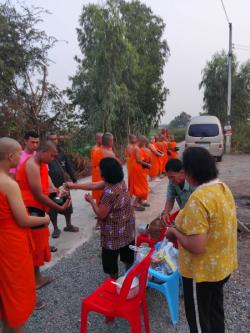 เจ้าหน้าที่งานป้องกันฯ นำรถตู้ และรถตรวจการณ์ อำนวยความสะดวกรับพระและเณร ทั้งหมด 16 รูปในการออกรับบิณฑบาตจากประชาชน ในชุมชนหมู่ 1, 2, 3 ตำบลบ้านกระทุ่ม