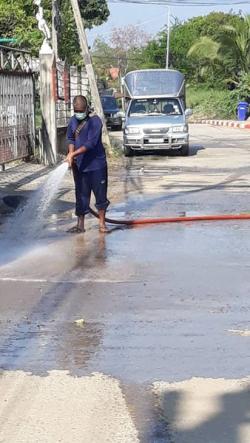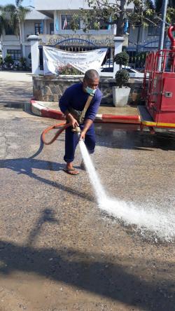 งานป้องกันฯ นำรถบรรทุกน้ำฉีดล้างทำความสะอาดบริเวณลานหน้าสำนักงานเทศบาล และบริเวณโรงจอดรถดับเพลิง
